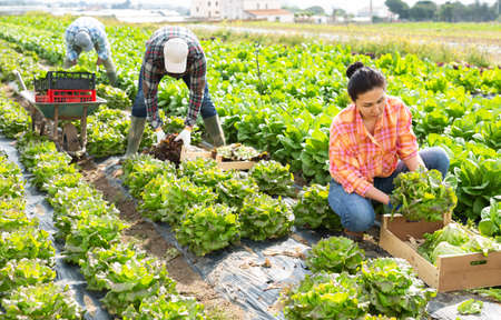 Multiethnic team of farm workers picking lettuce