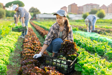 Young female worker harvesting red lettuce at vegetable plantation
