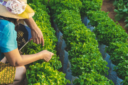 Hand of female gardener research and checking quality fresh Green Oak Lettuce with digital tablet in organic farm. Asian farmer control on Green Oak Lettuce field. Agriculture or cultivation concept.