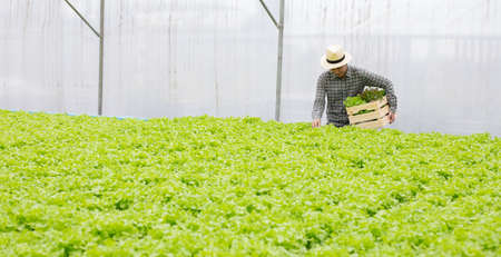 Male gardeners are collecting organic vegetables harvested from the Hydroponics vegetable farm, put in a wooden basket that him carry with smile on foreground green vegetable.