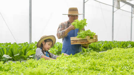 Happy farmer grandfather and little girl working in hydroponic greenhouse farm, clean food and healthy eating concept