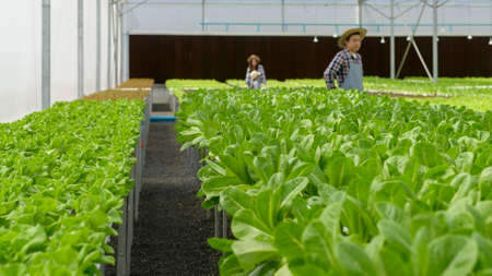 A group of farmers working in hydroponic greenhouse farm, clean food and healthy eating concept