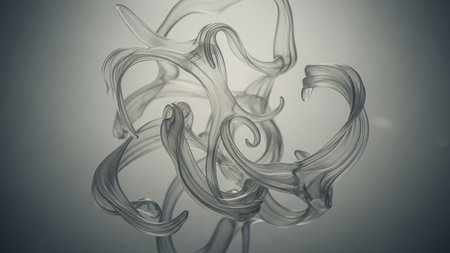 An ethereal abstract sculpture made of transparent gray material, featuring swirling, flowing organic lines and delicate, intricate curves.