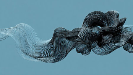 Curving black lines intertwine gracefully against a blue background, forming an intricate abstract design that flows with movement and fluidity.