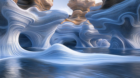 Abstract landscape featuring blue, cave-like structures with a woven texture, reflecting in the water. The structures have a unique, flowing design.