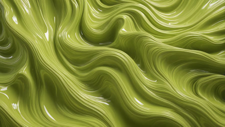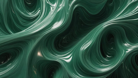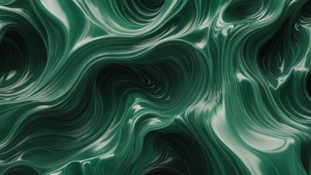 An abstract pattern of smooth, glossy dark green waves flowing and undulating, creating a visually dynamic and...
