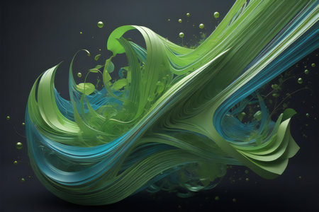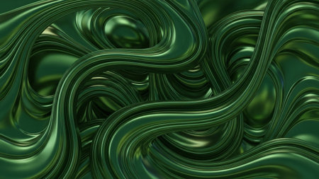 Deep green metallic ribbons and waves swirl and reflect light, creating a smooth, fluid, and organic abstract...