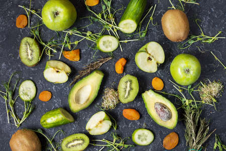 Ingredients for cooking smoothie. Organic green vegetables and fruits on black stone background. Flat lay