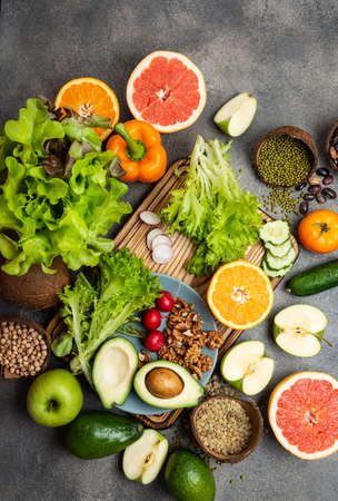 Healthy eating ingredients: fresh vegetables, fruits and superfood. Clean eating and detox. Nutrition, diet, vegan food.