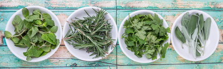 Rosemary, mint, parsley and sage leaves herbs in white bowl over wooden background