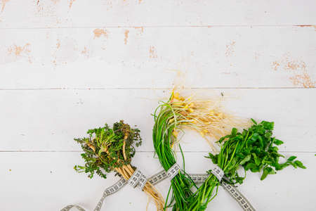Herbs in bundle on white wooden background, close up