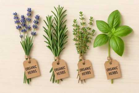Organic herbs composition featuring lavender, rosemary, thyme, and basil on light wooden surface. concept of natural ingredients, herbal collection, culinary usage.