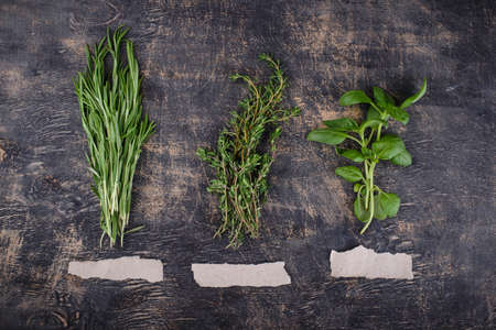Mix of fresh Italian herbs from garden on an old table. Rosemary, temyan, oregano. Dark background. Dry chili