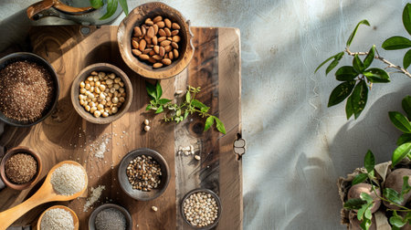 A diverse composition of nutritious food items elegantly presented in a balanced arrangement.