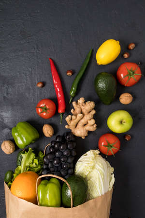 a large paper bag with fresh vegetables and fruits. the right choice of healthy foods. vegan food. black background