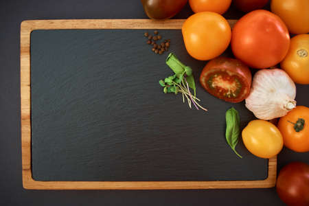 Vegetables dark background with copy space. Healthy meal. Menu, price background. Tomatoes on black chalkboard.