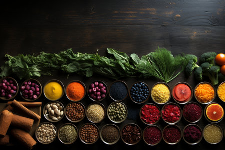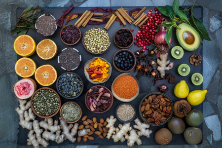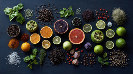 A stunning display of assorted fruits, herbs, and spices arranged artistically on a dark surface, perfect for culinary inspiration and healthy cooking themes.