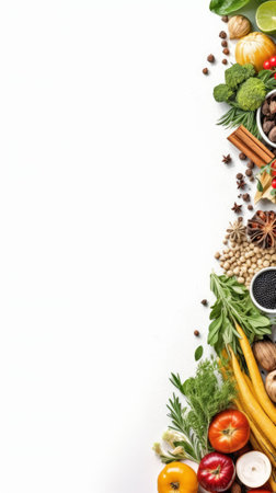 Wholesome food banner: pristine flat lay of organic fruits, vegetables, and ingredients.