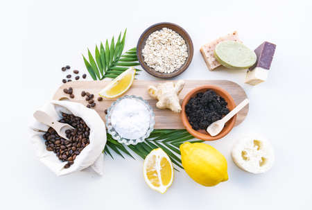 Zero waste, eco friendly Natural cosmetic product for cleaning and care. Ingredients DIY Flat lay Life without plastic.