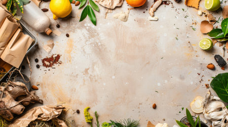A detailed shot of fresh ingredients laid out on a kitchen counter, including herbs, vegetables, and spices, ready for cooking.