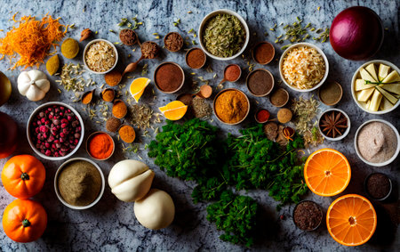 Variety of fresh spices and vegetables arranged on a rustic table. The vibrant colors and natural textures create an inviting culinary scene.