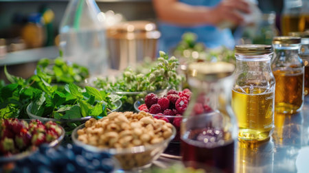 A hands-on workshop setting, where participants are learning to make their own cortisol-reducing drinks, featuring a variety of ingredients like wild berries, nuts, and green tea extracts.