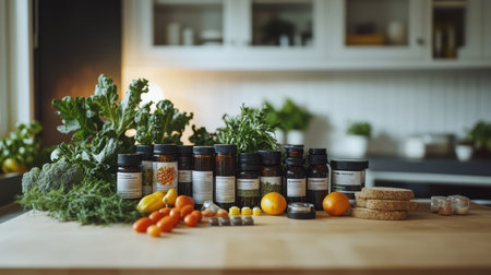 An artistic layout of fresh produce and vitamin bottles in a well-lit kitchen, emphasizing health and nutrition