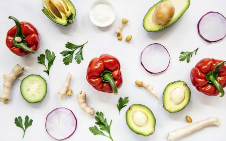 Ingredients for a delicious recipe arranged in a flat lay, showing culinary creativity.