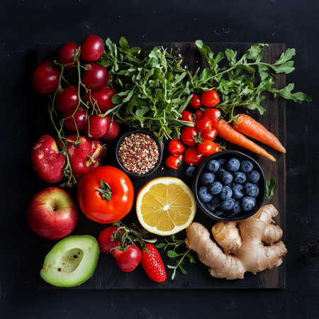 Fresh organic produce on dark background: apples, ginger, blueberries, and more.