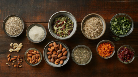A beautiful flat lay arrangement of assorted nuts and seeds in rustic bowls, perfect for showcasing healthy ingredients for cooking and meal prep.