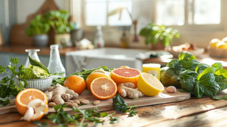 Bright morning light shines on a wooden table filled with fresh citrus fruits, leafy greens, and ginger, suggesting a healthy lifestyle.