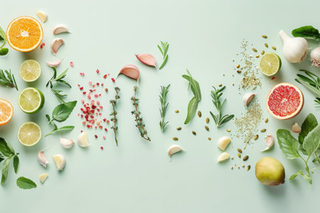 This vibrant image showcases a variety of fresh herbs, citrus, and natural elements arranged artistically against a bright green background, emphasizing freshness and vitality.