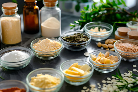 Vibrant collection of nutrient rich superfoods, seeds, and spices meticulously arranged in glass jars on a light marble background, perfect for healthy living themes