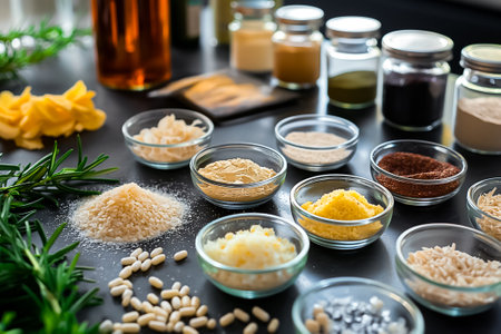 Various ingredients, including spices, herbs, and condiments, are organized in glass bowls on a kitchen counter, ready for cooking and meal preparation.