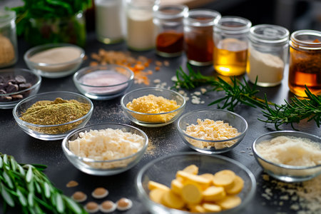 A variety of spices, nuts, and herbs are arranged on a kitchen countertop, showcasing colorful glass bowls filled with ingredients ready for cooking and meal preparation.