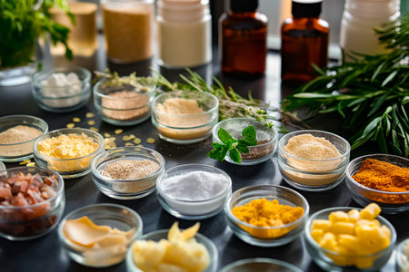A close-up image showing natural skincare products surrounded by fresh fruits, herbs, and flowers.