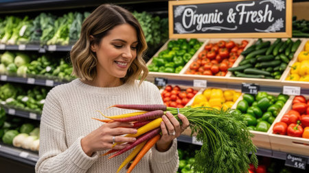 A woman holds a bundle of colorful carrots in a supermarket. The image showcases various vegetables arranged on shelves, with a sign reading Organic & Fresh. The composition features natural lighting and offers potential uses for advertising healthy food and lifestyle choices. This scene suggests a focus on wellness.