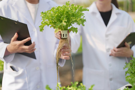 African American researcher and plant genetics expert. Test the quality and bacteria in the hydroponics vegetable garden. Researchers are collecting samples to test vegetables grow