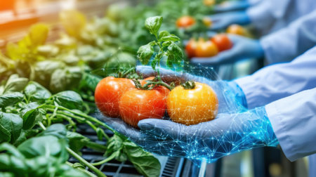 Hands showcase fresh organic tomatoes with a digital overlay symbolizing advances in agriculture technology and the importance of sustainable farming methods for the future.