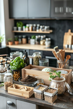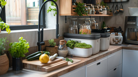 a zero-waste kitchen with a compost bin and jars of spices in view, created with generative ai