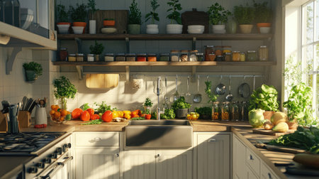 This welcoming kitchen radiates warmth, showcasing wooden shelves adorned with herbs and vegetables. Sunlight streams in, highlighting a cooking area ready for culinary adventures.