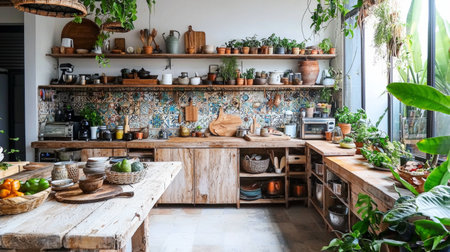 A beautifully designed rustic kitchen featuring wooden shelves adorned with plants and pottery, creating a cozy and inviting atmosphere filled with natural light.