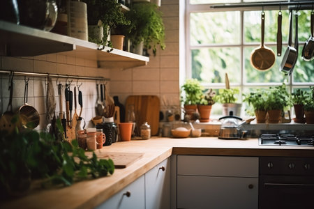 Modern kitchen interior with wooden countertop and wooden utensils.
