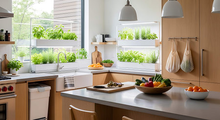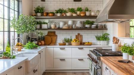 This modern kitchen showcases a fresh and inviting atmosphere with herbs, stylish decor, and an organized layout, perfect for home cooking and culinary creativity.