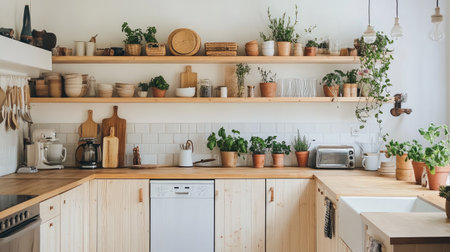 A cozy kitchen scene featuring wooden shelves adorned with jars and plants. This serene space showcases organized kitchenware, enhancing cooking ambiance.
