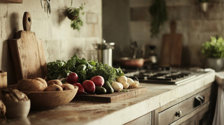 Freshly harvested vegetables placed on a rustic kitchen counter generative ai