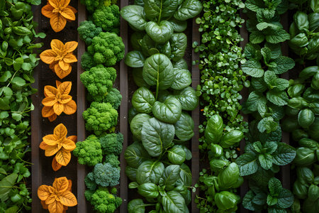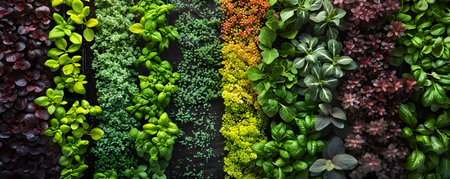 Vibrant vertical garden featuring a diverse mix of fresh herbs, lettuce, spinach, and other leafy greens arranged in neat rows. ideal for urban farming enthusiasts, gardening inspiration, and sustainable living concepts. Generative AI