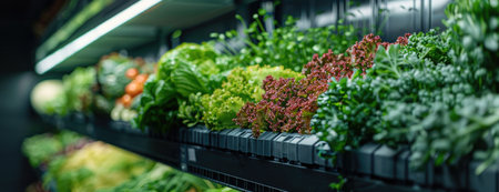 This vertical farming system features rows of fresh green lettuce flourishing under bright LED lights. The plants are well-arranged in a controlled environment, promoting efficient growth.