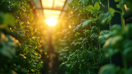 Sunlit Greenhouse with Lush Plants and Fresh Greenery at Sunrise