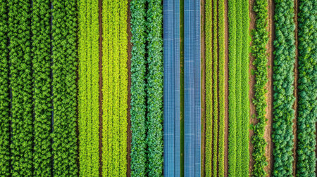 This aerial view captures vibrant green fields filled with crops, intersected by solar panels, showcasing the fusion of agriculture and renewable energy.